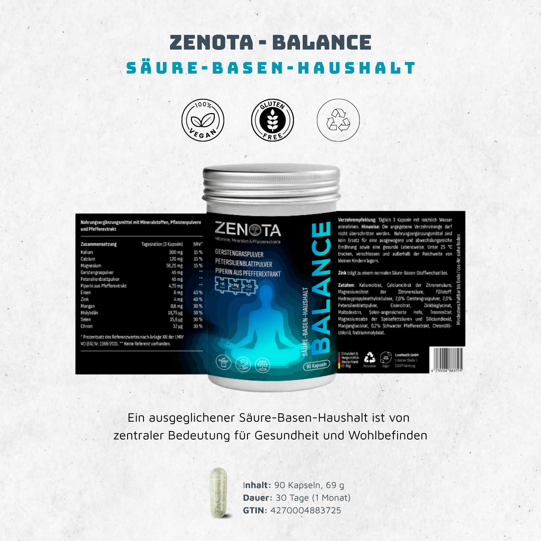 Die empfohlene Tagesdosis sollte nicht überschritten werden. Nahrungsergänzungsmittel sind kein Ersatz für eine ausgewogene Ernährung und einen aktiven Lebensstil.