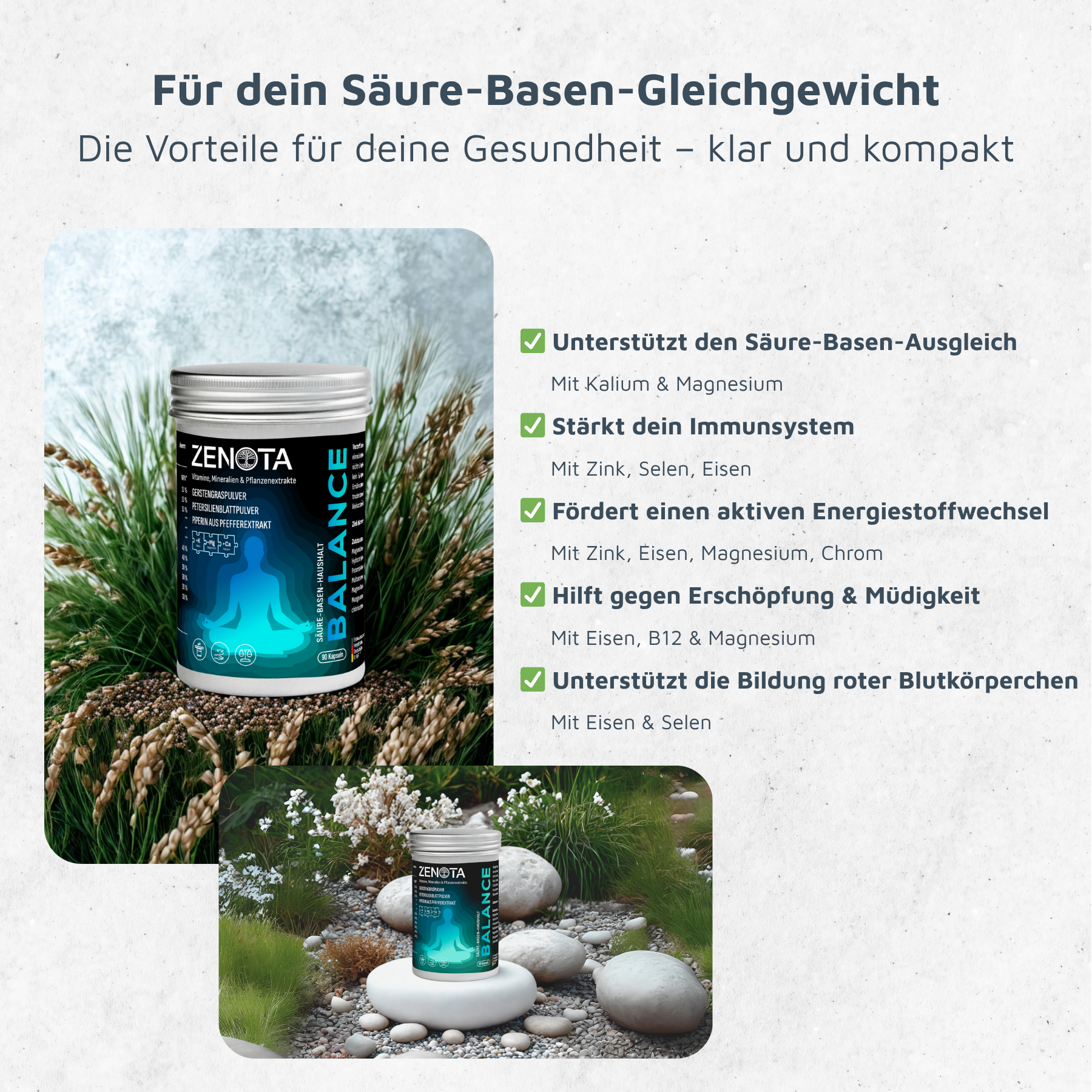BALANCE liefert essentielle Mineralstoffe und Zink, unterstützt den Säure-Basen-Haushalt, fördert Muskel- und Nervenfunktion und hilft, Müdigkeit zu reduzieren – für mehr Wohlbefinden im Alltag.