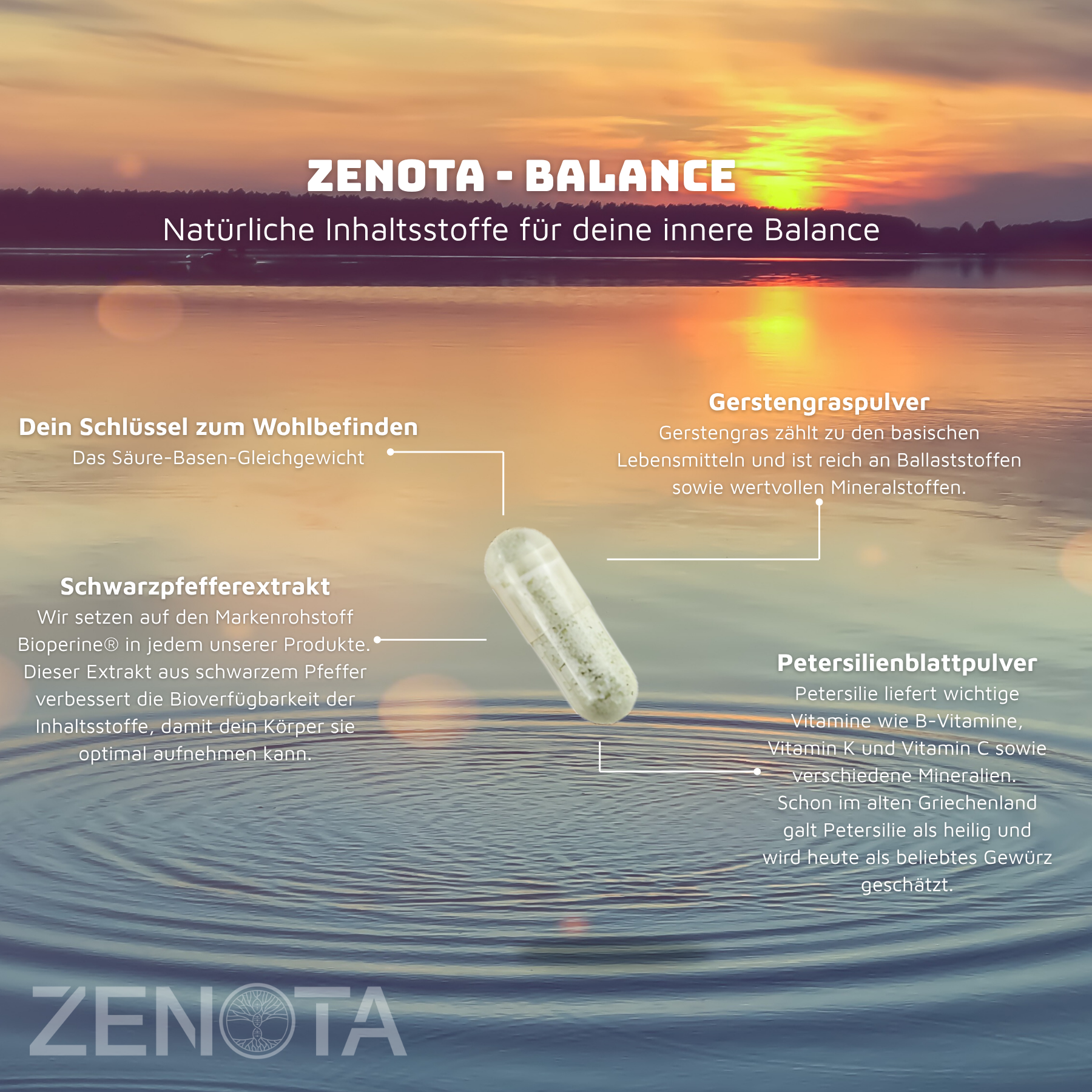 Das Produkt ist für Erwachsene bestimmt und sollte außerhalb der Reichweite von Kindern aufbewahrt werden. Balance enthält den natürlichen Extrakt BioPerine® aus schwarzem Pfeffer, der die Aufnahmefähigkeit der enthaltenen Stoffe verbessern kann – denn entscheidend ist, was der Körper tatsächlich verwertet.