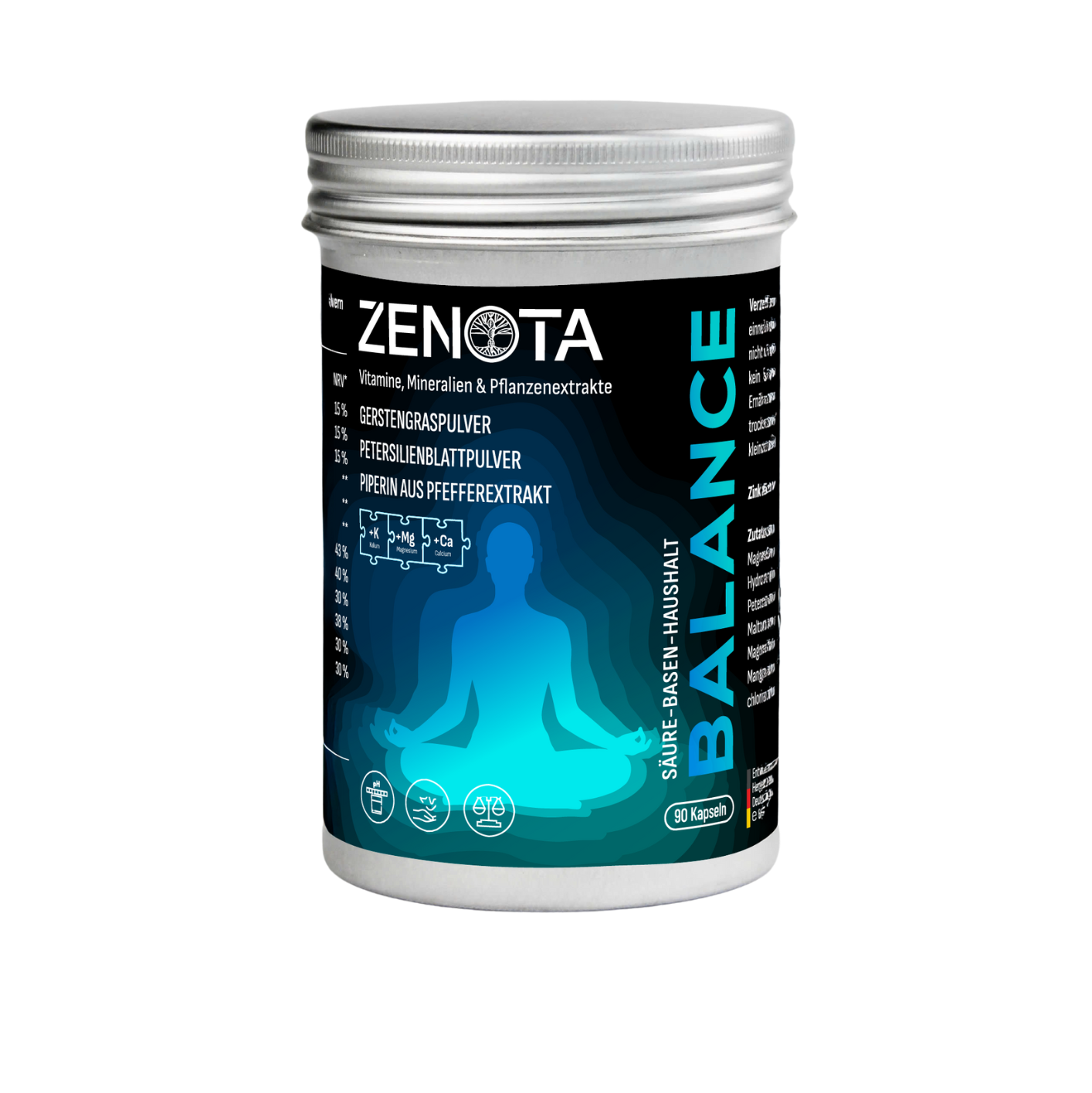 Zusammensetzung: Kaliumcitrat, Calciumsalze der Zitronensäure, Magnesiumsalze der Zitronensäure, Füllstoff: Hydroxypropylmethylcellulose, 2,0% Gerstengraspulver, 2,0% Petersilienblattpulver, Eisencitrat Maltodextrin, Zinkbisglycinat, Selen-angereicherte Hefe, Trennmittel: Magnesiumsalze der Speisefettsäuren und Siliciumdioxid, Mangangluconat, 0,2% Schwarzer Pfeffer-Extrakt (BioPerine®), Chrom(III)-chlorid, Natriummolybdat.