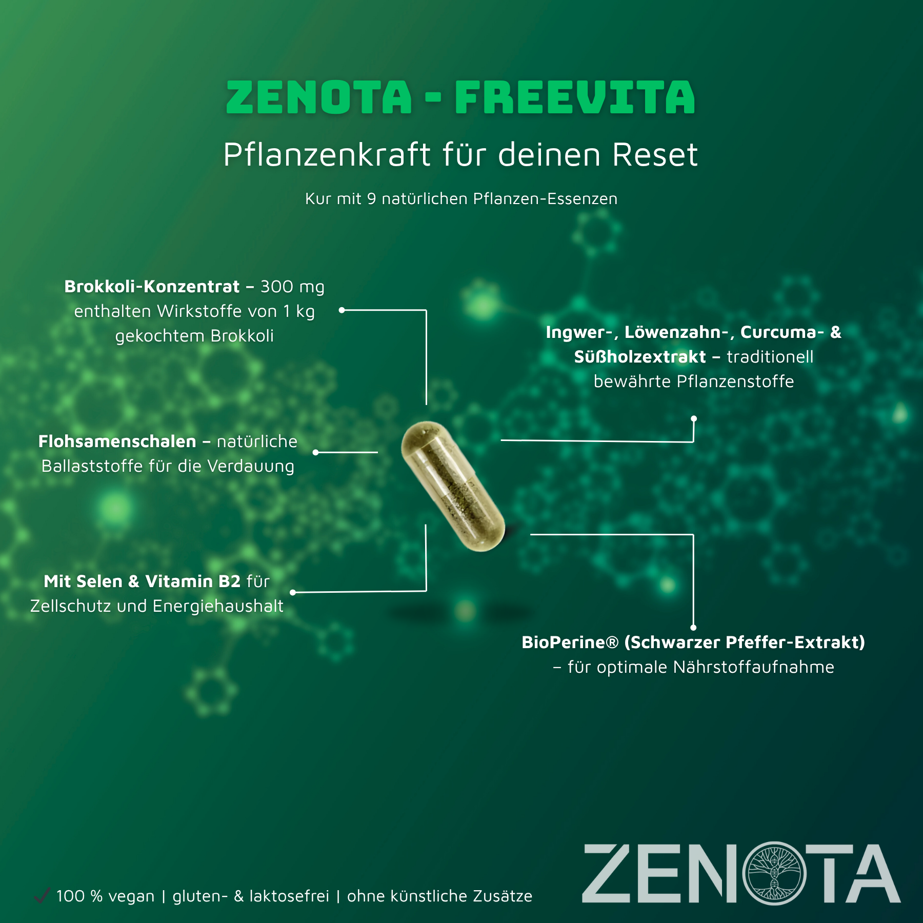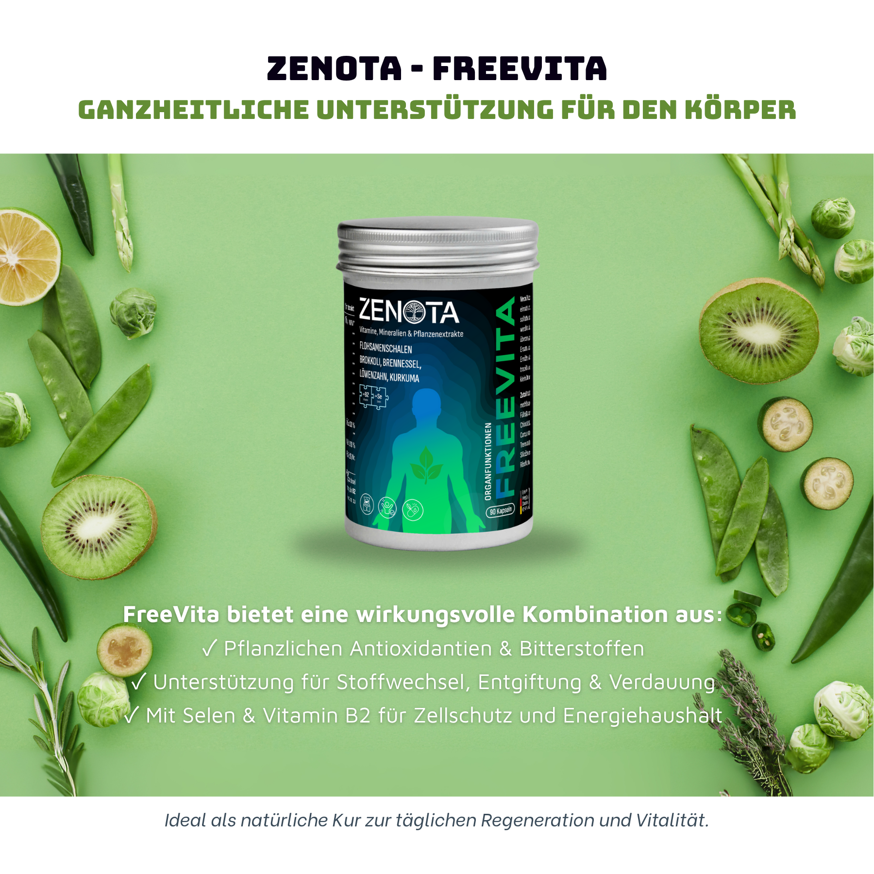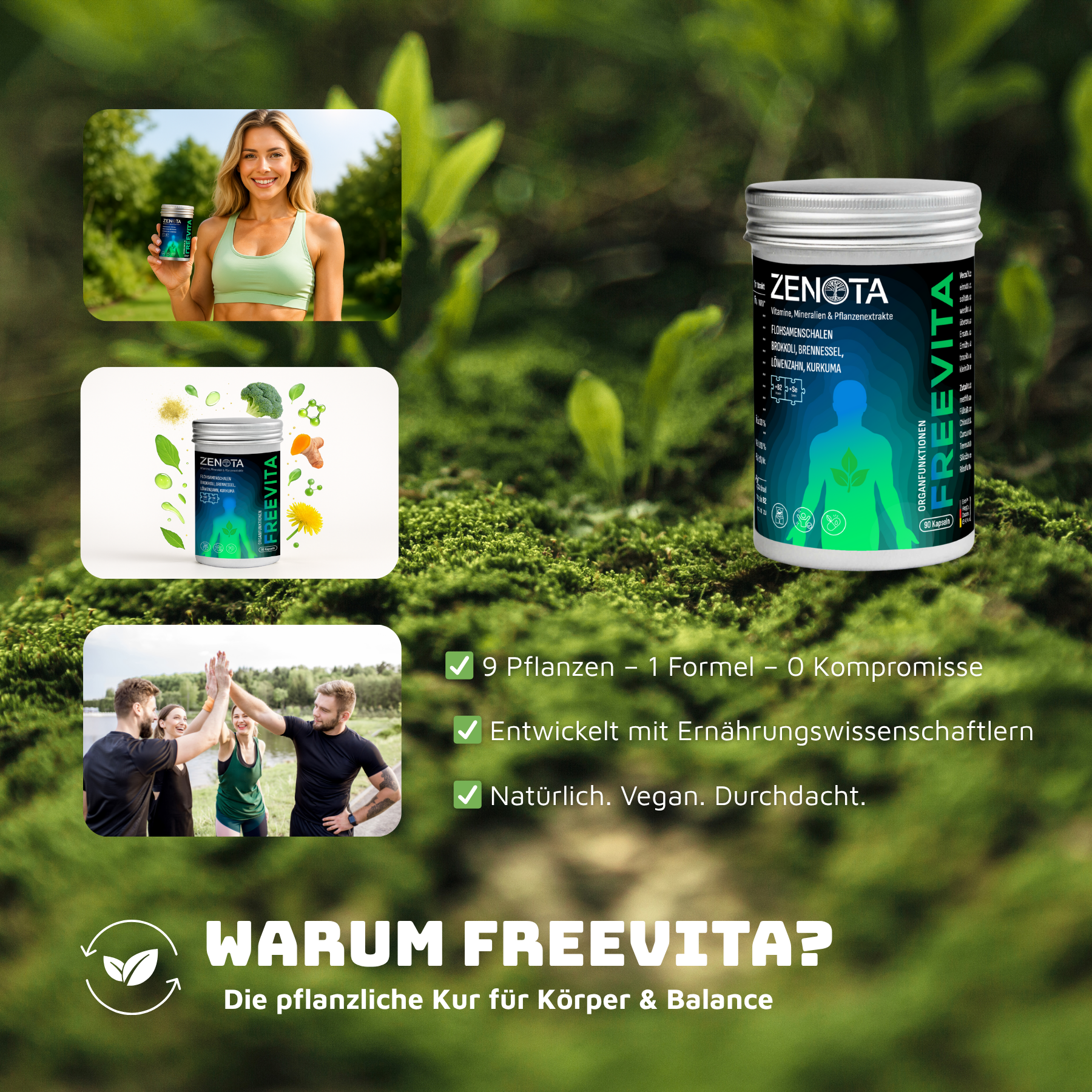 FREEVITA kombiniert 9 kraftvolle Pflanzenextrakte mit Vitaminen & Mineralstoffen – für natürliche Entgiftung, antioxidativen Schutz und gesteigertes Wohlbefinden.